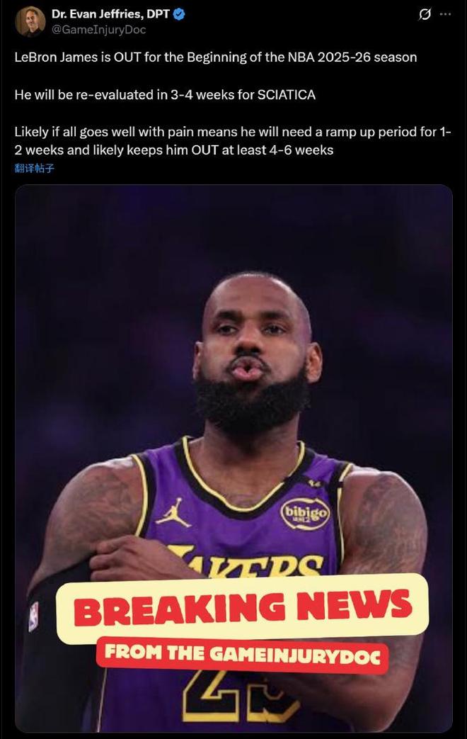 一位NBA高管匿名接受Lakers Daily记者Ashish Mathur采访时表示:“坐骨神经痛真的非常痛苦,詹姆斯的身体恢复速度已经大不如前,如果他在10月或11月不打比赛,我对此不会感到惊讶。湖人必须谨慎对待詹姆斯的这次伤病,我认为他们会非常谨慎小心。”