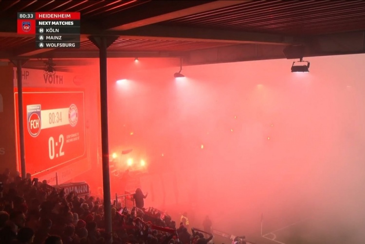 12月22日讯 德甲第15轮比赛,拜仁客场4-0击败海登海姆。此役拜仁球迷在看台上违规燃放烟火,导致比赛一度中断。